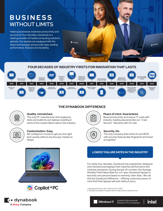 For nearly four decades, Dynabook has engineered, designed, and manufactured laptops that maximize performance and minimize downtime. During the last 24-months, the Average Monthly Field Failure Rate for U.S. spec Dynabook laptops is less than one percent based on warranty claim data. We call this the Dynabook Difference - offering customers peace of mind that their laptops will work without worry.